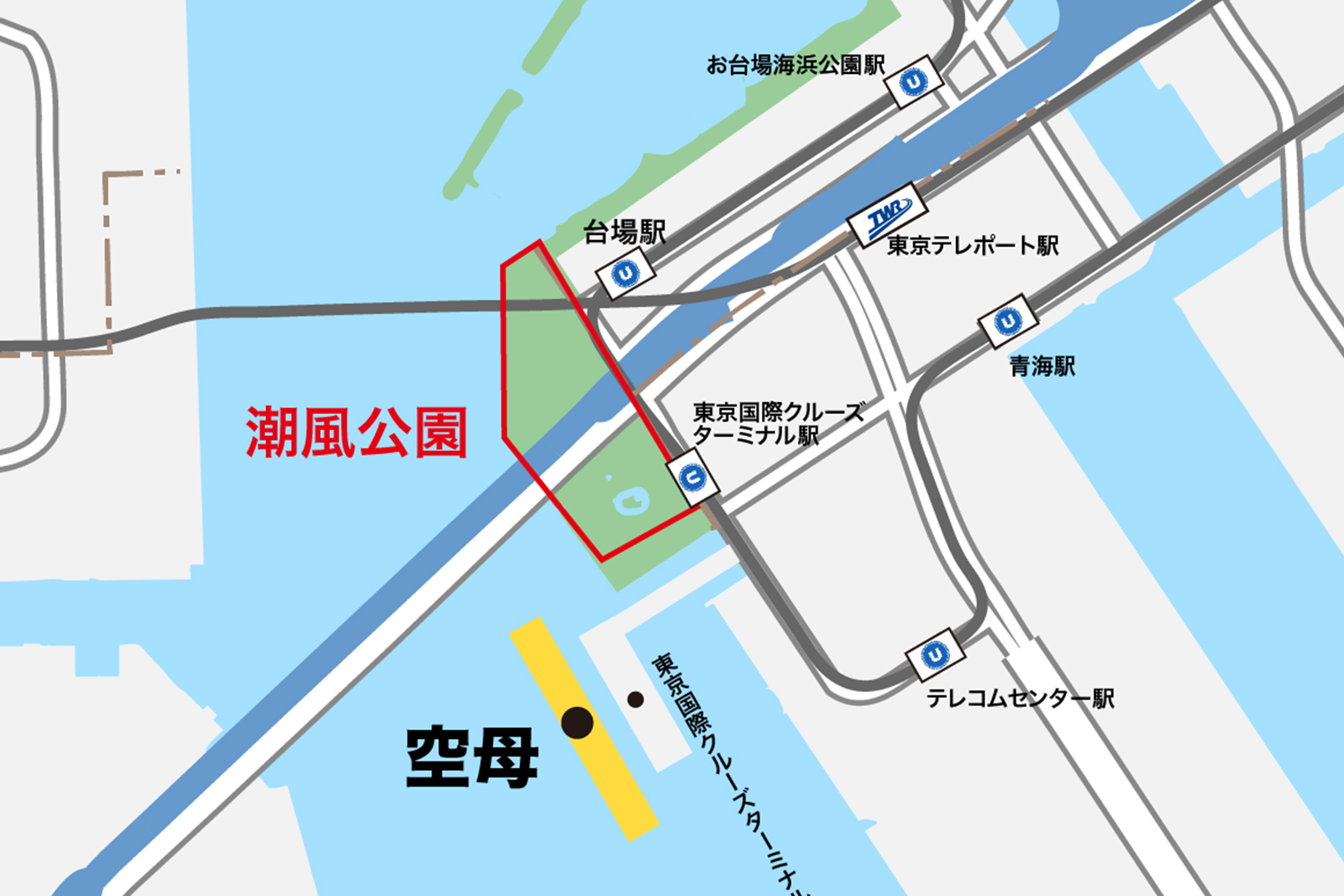 ここは東京国際クルーズターミナル駅下車すぐ、潮風公園南西に位置する場所です