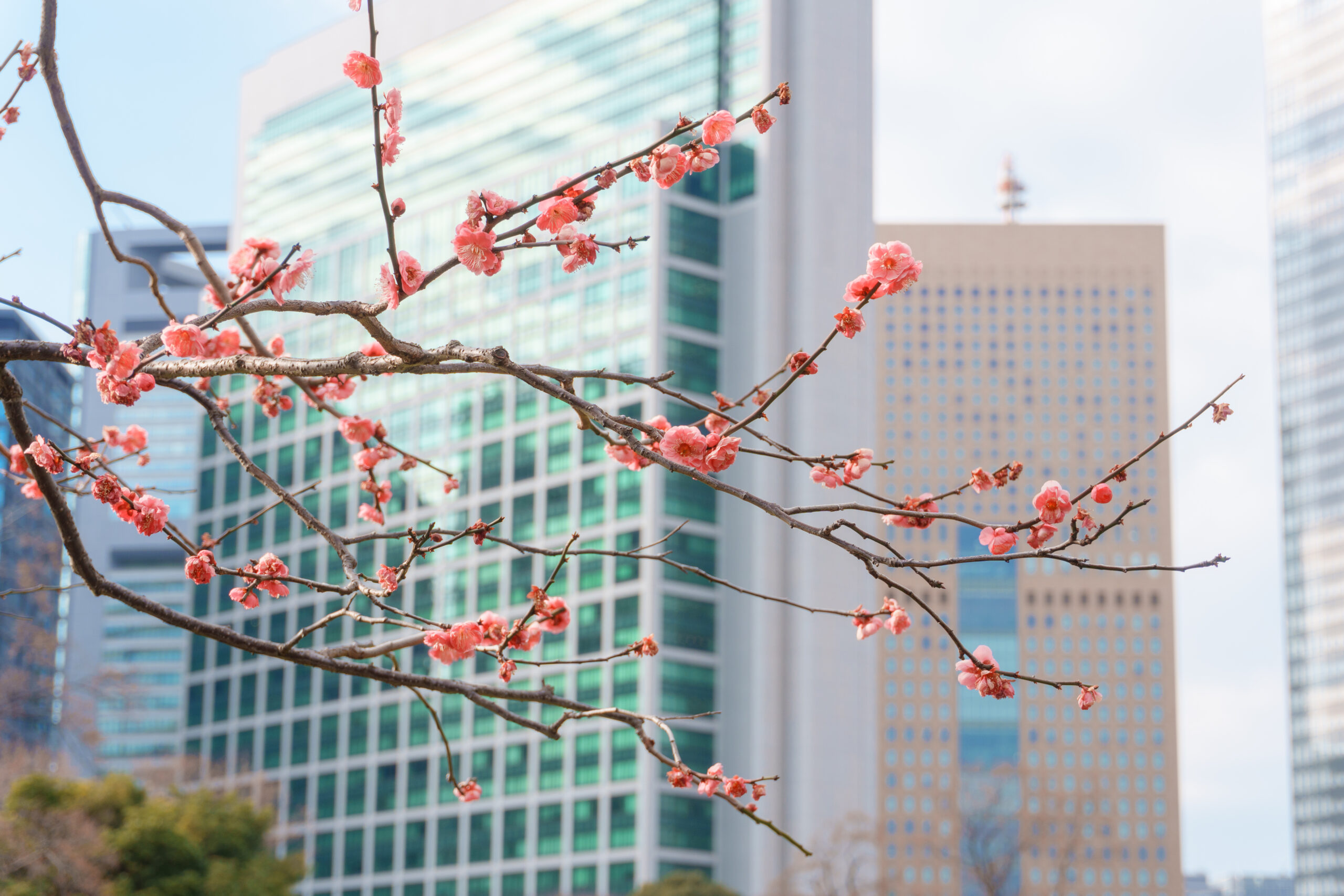 梅に焦点を当て、ビルをぼかして撮影できる写真は浜離宮ならではだろう。