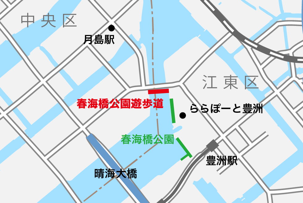 春海橋公園遊歩道は春海橋公園の一部として追加開園し、豊洲エリアと晴海エリアを結びます