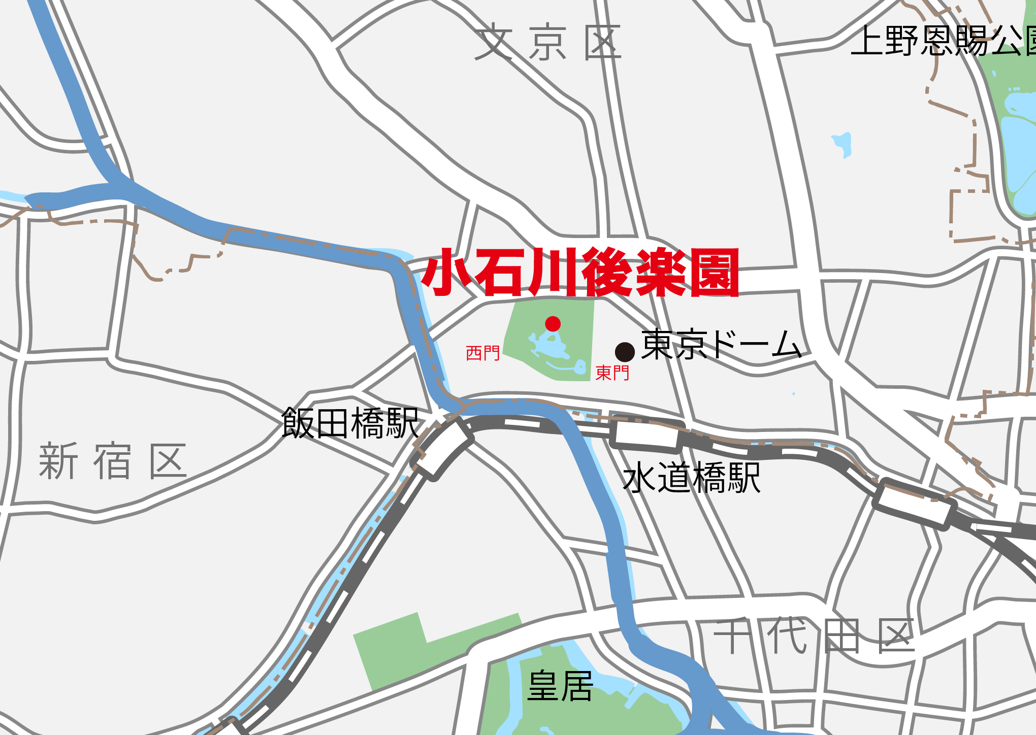 小石川後楽園は、たくさんの駅に囲まれたアクセスのよい場所に立地しています