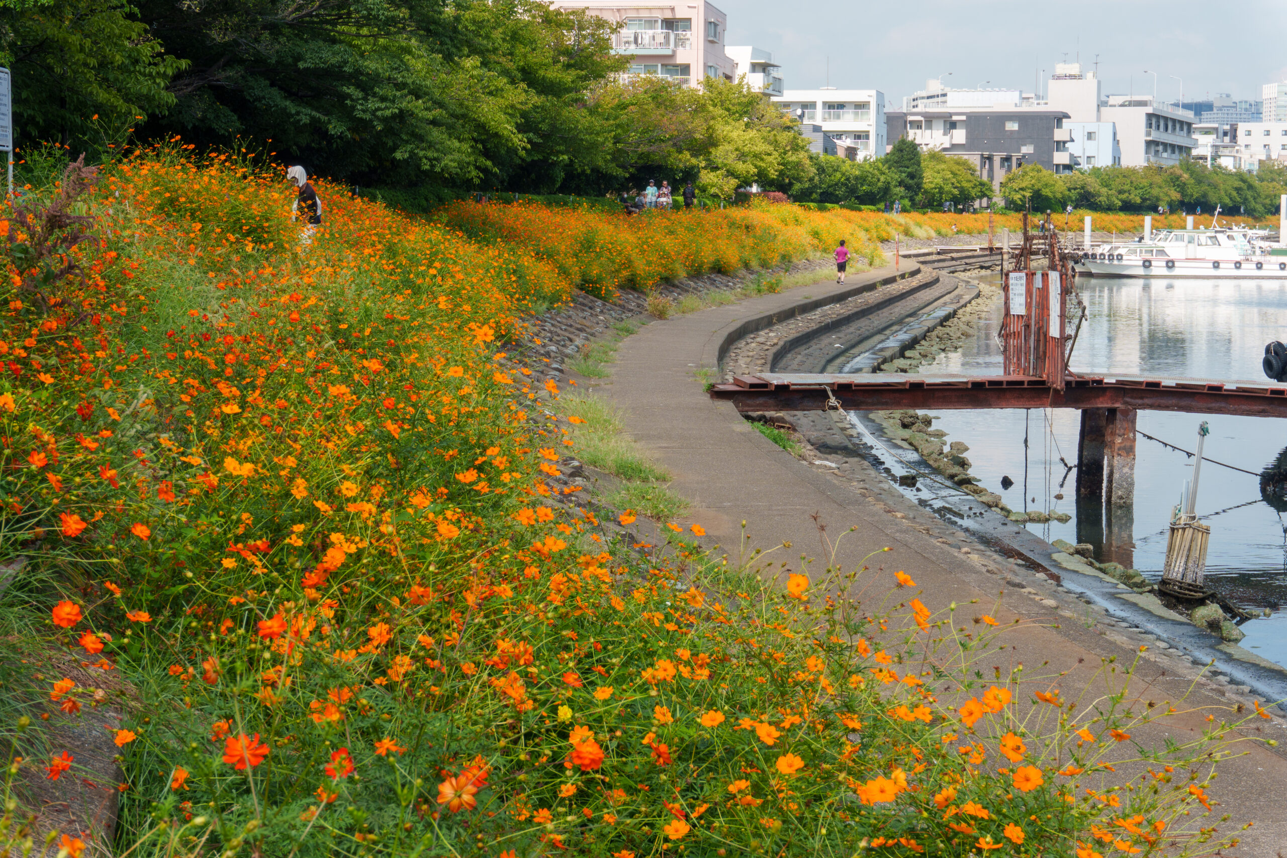 堤防を登るとそれまでの閑静な住宅街が一転、開けた運河とオレンジが映えるキバナコスモスが一面に広がる