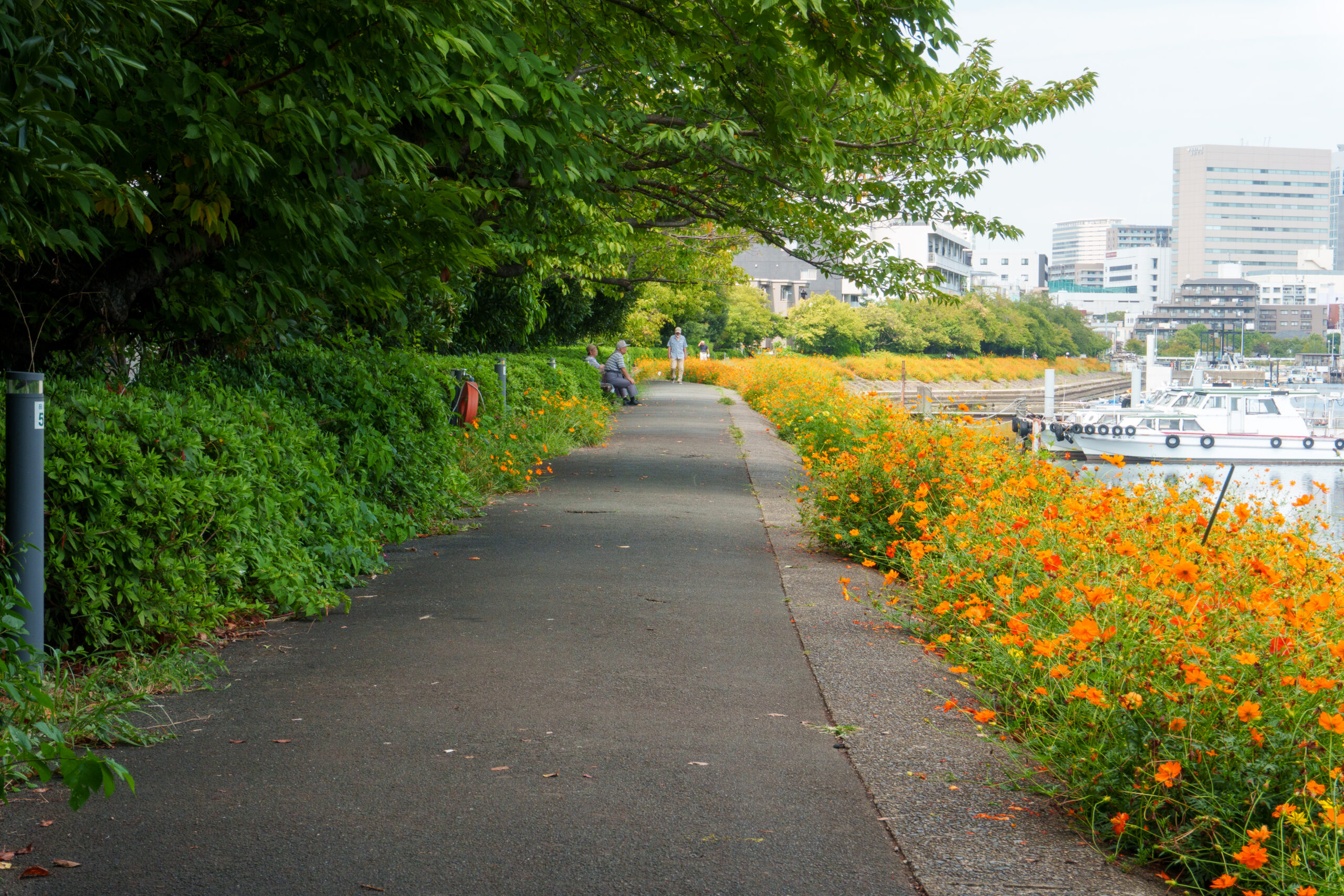 運河を沿って歩きながらコスモスを鑑賞できるのは、東京でもこの「しながわ花海道」ならではだ