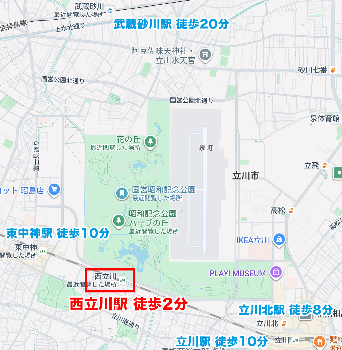 こうしてみると、西立川駅の公園までの近さが際立っていると思います