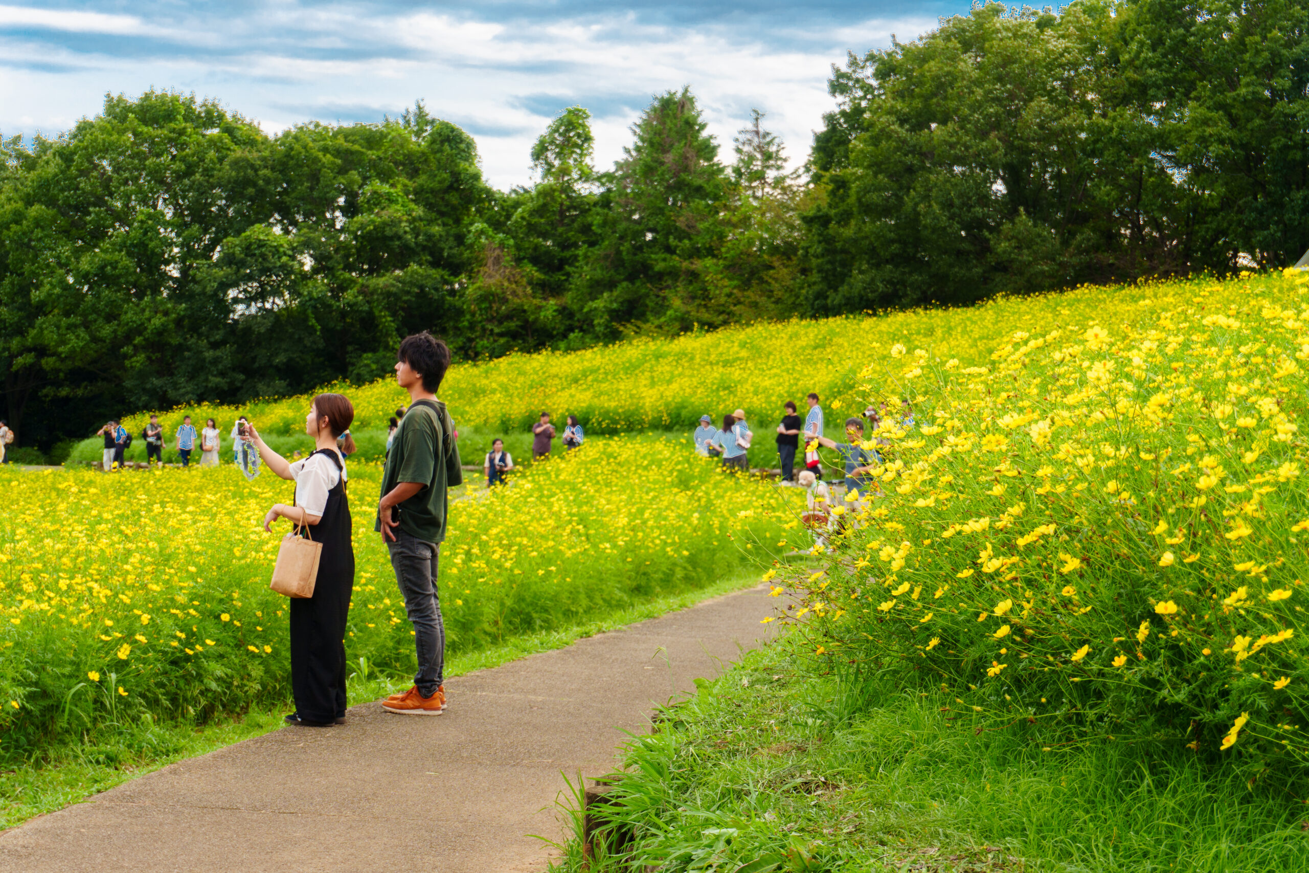 記念撮影をする際は、通路に立った上でカメラマンに下の段から撮影してもらえれば、手前にも背景にもコスモスを配置した1枚になりますよ