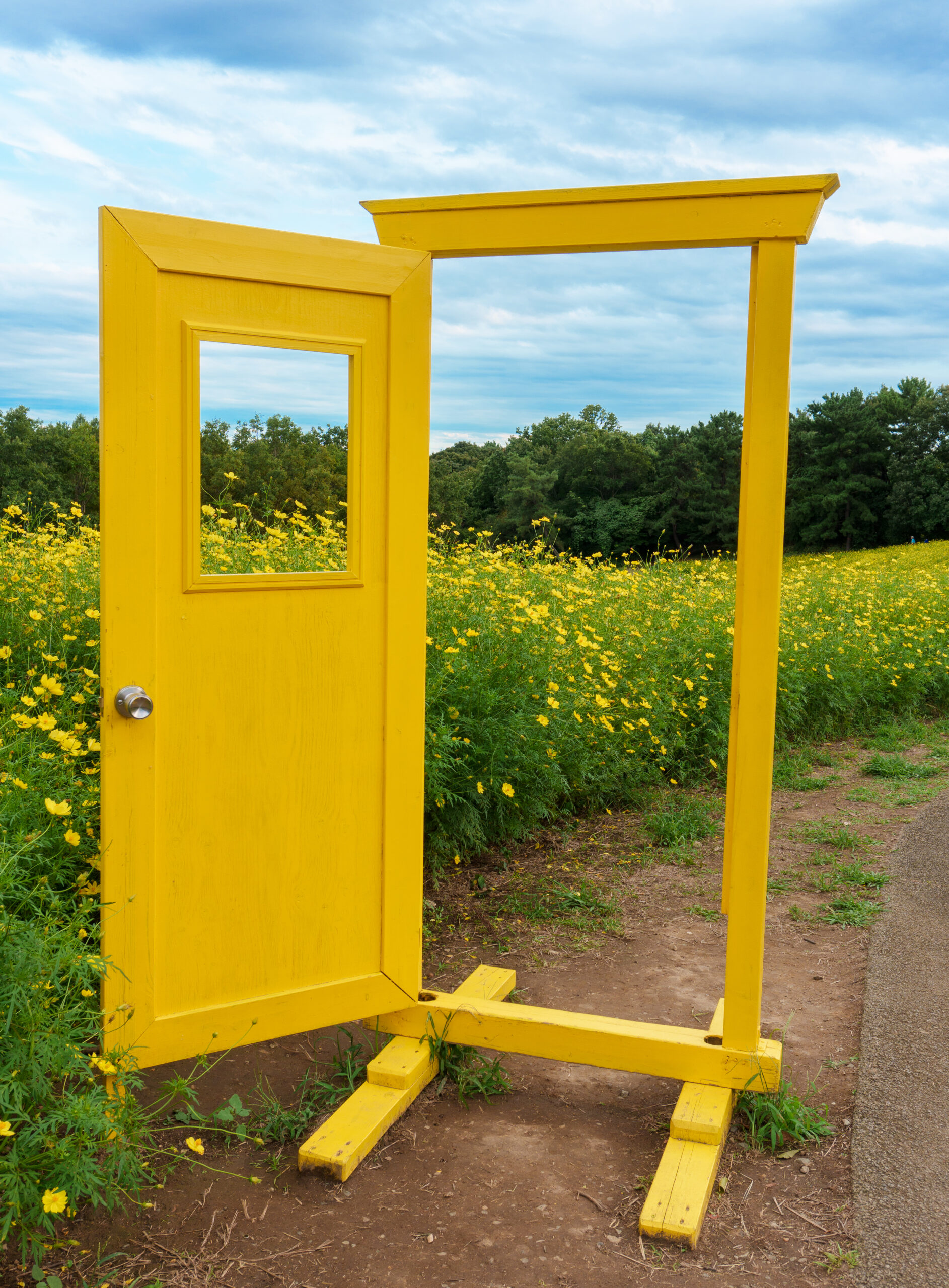 ここに限らず園内の4つのコスモス畑には、写真のようなドアや様々な撮影用の小道具が設置されています