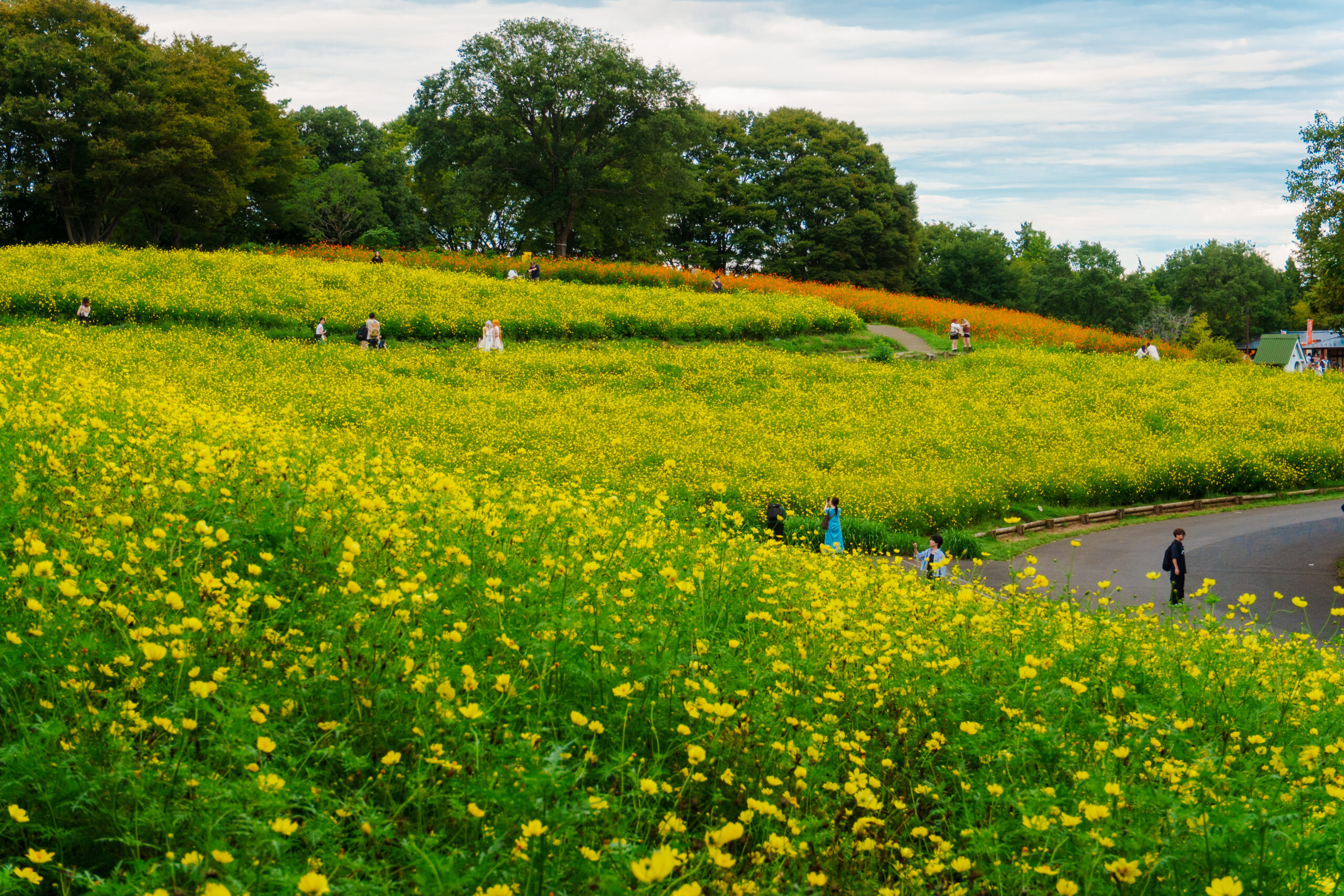 斜面に沿って積み重なるように咲く黄色いキバナコスモスは圧巻です