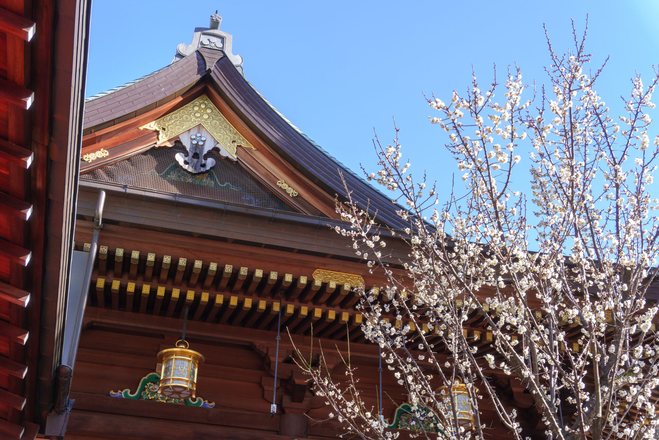 神社仏閣の魅力は、鳥居や社殿と、紅白の梅が織りなす「和のコントラスト」です。