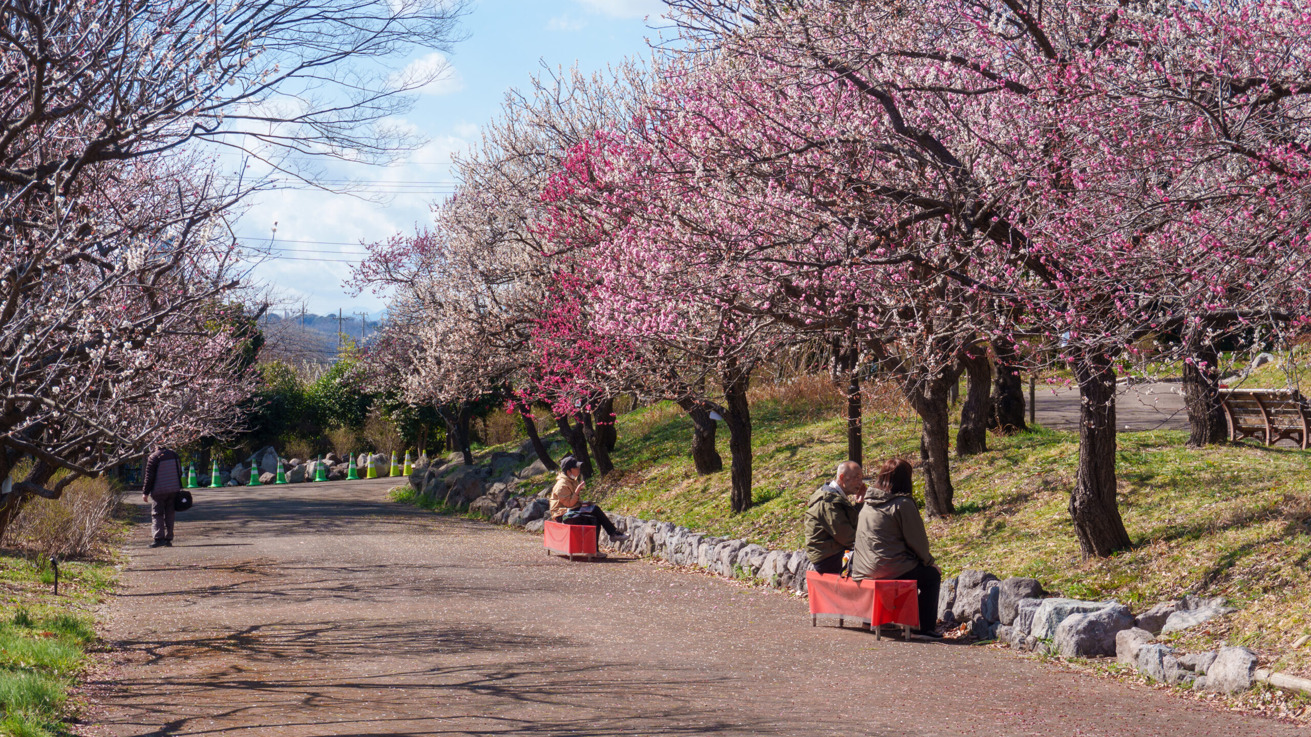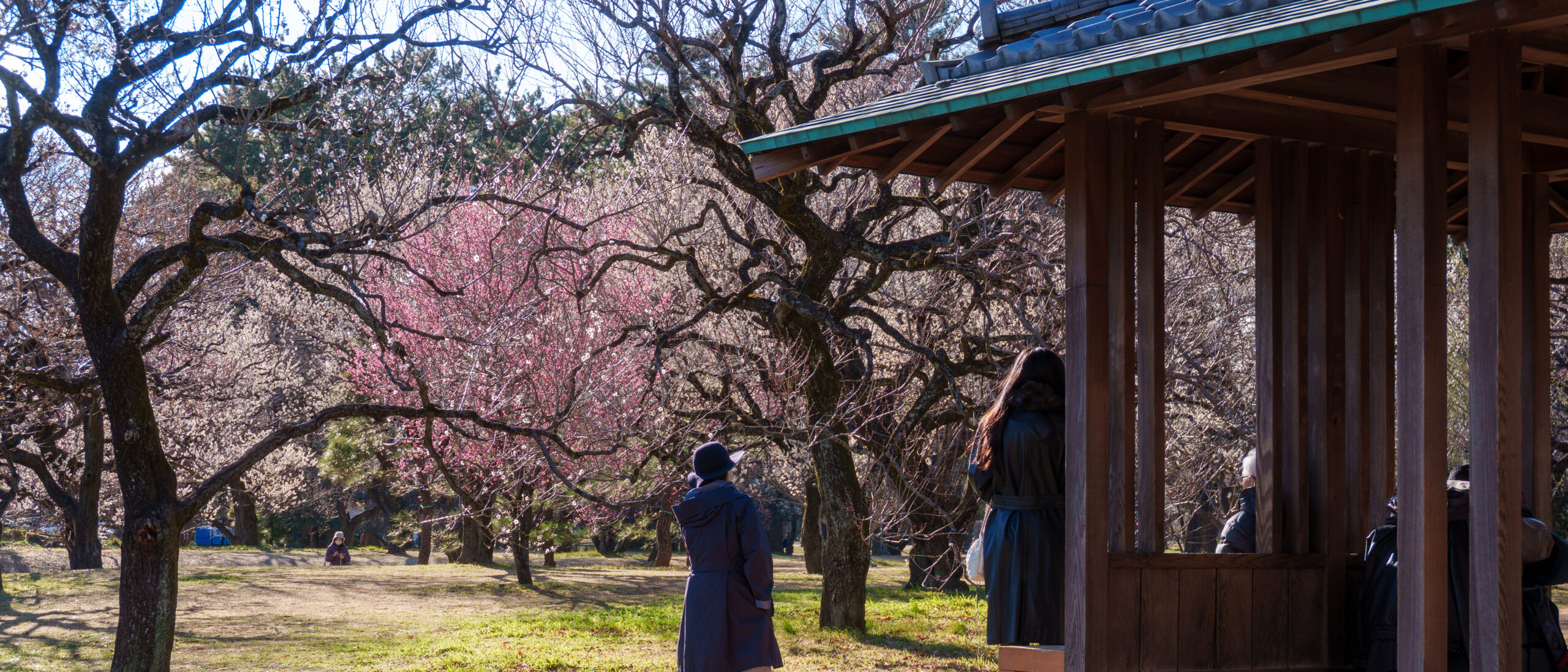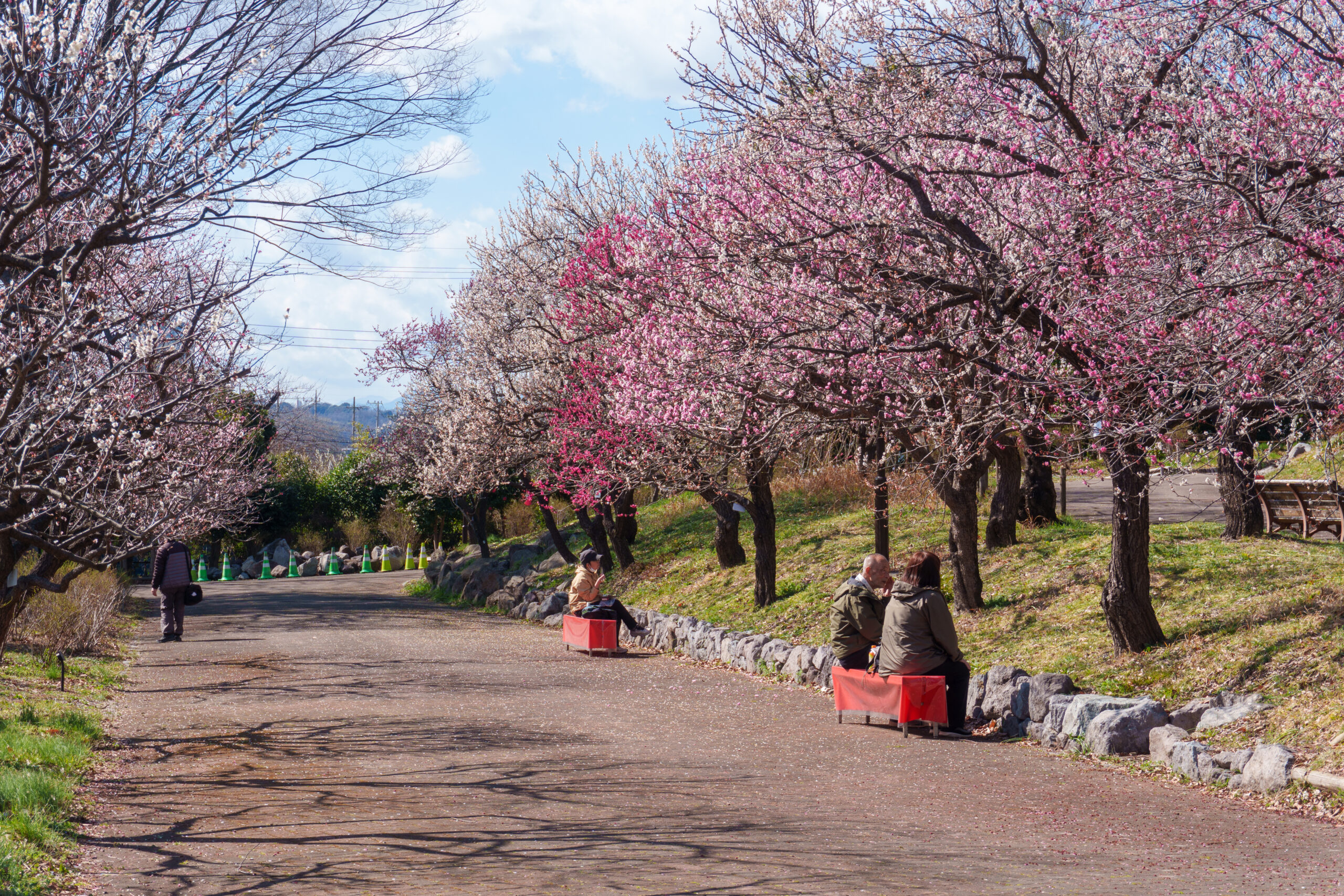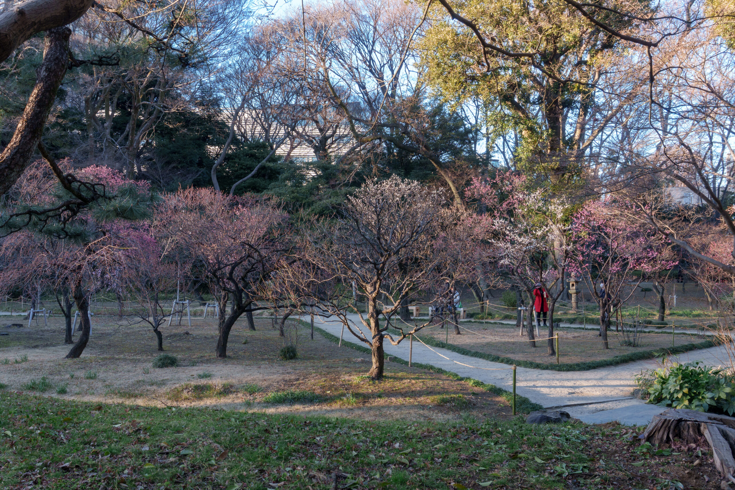 公園の梅スポットは、広大な敷地と圧倒的な本数が魅力です。