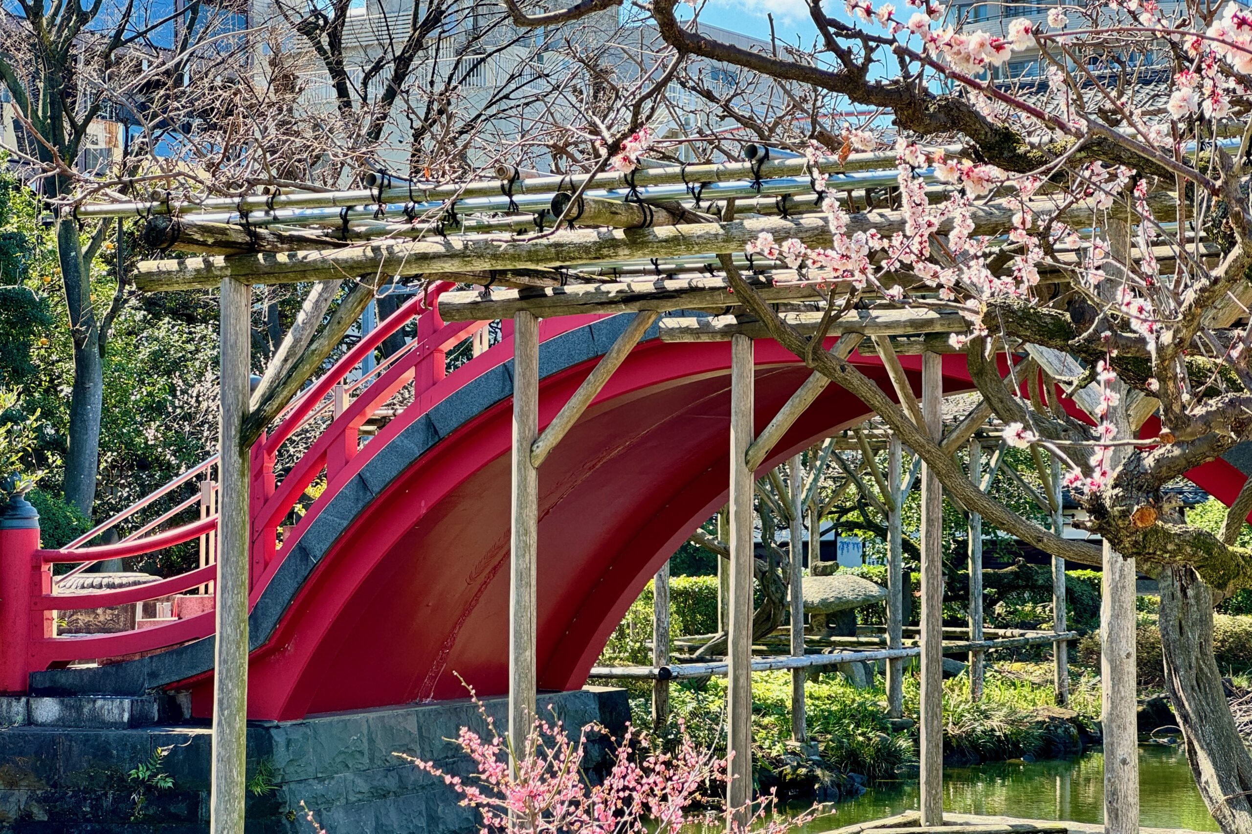 朱塗りのアーチ橋の手前に梅の花が重なる構図は、まさに日本の伝統美そのもの。