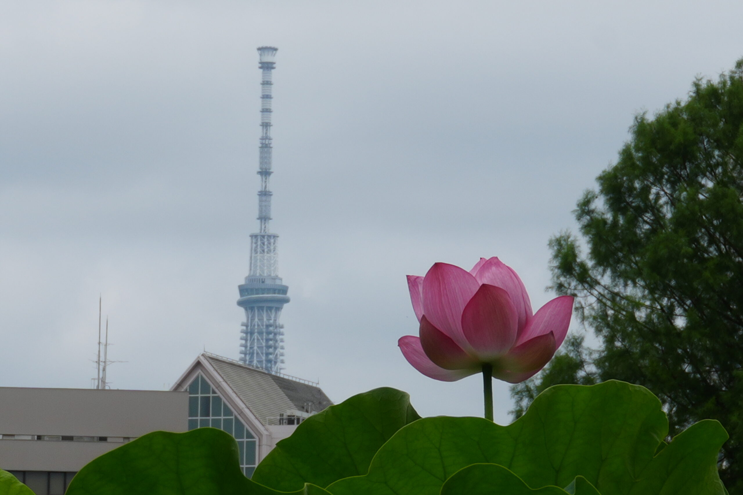 また、カメラの望遠レンズを使えば弁天堂やスカイツリーと蓮を一緒に撮影することができる