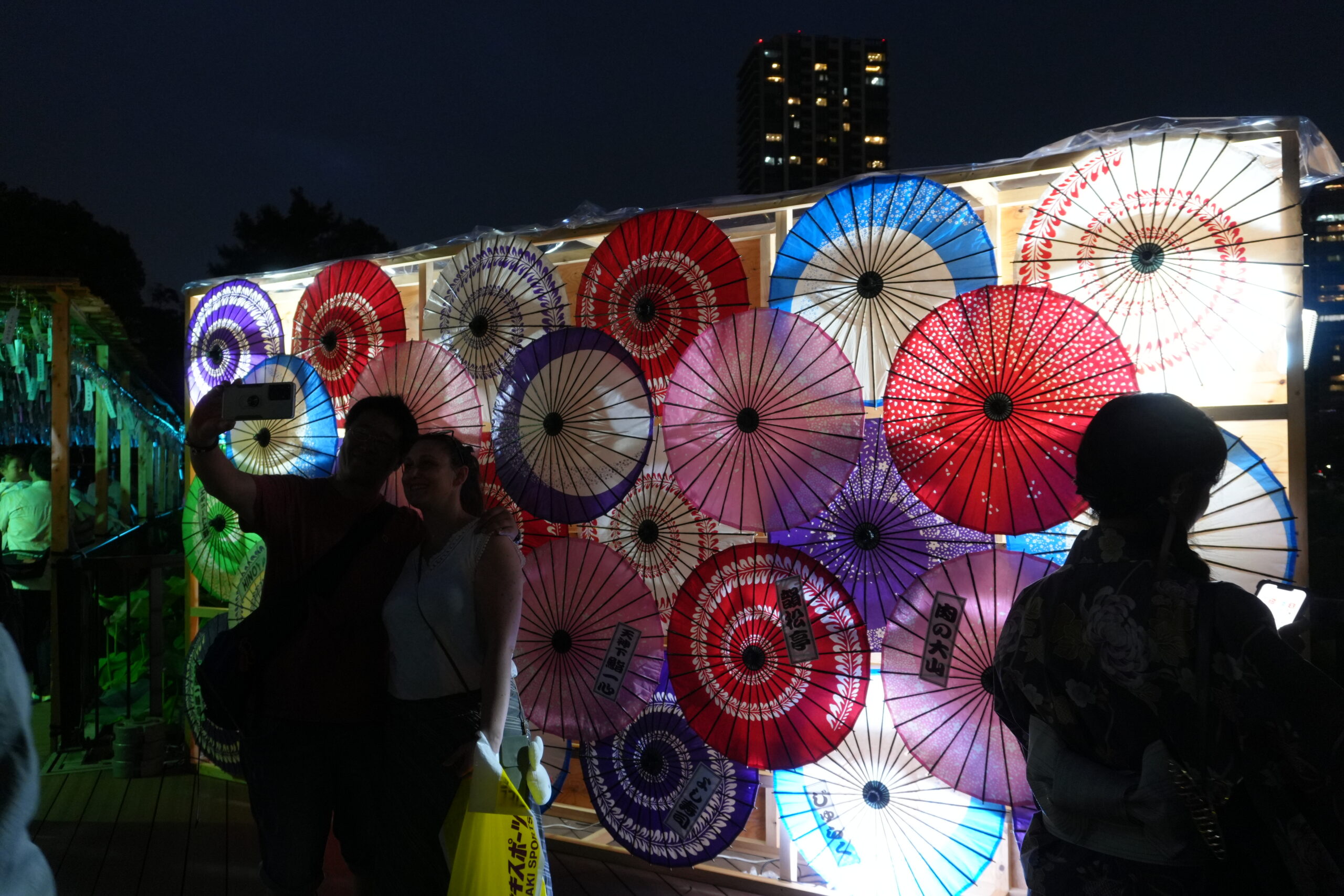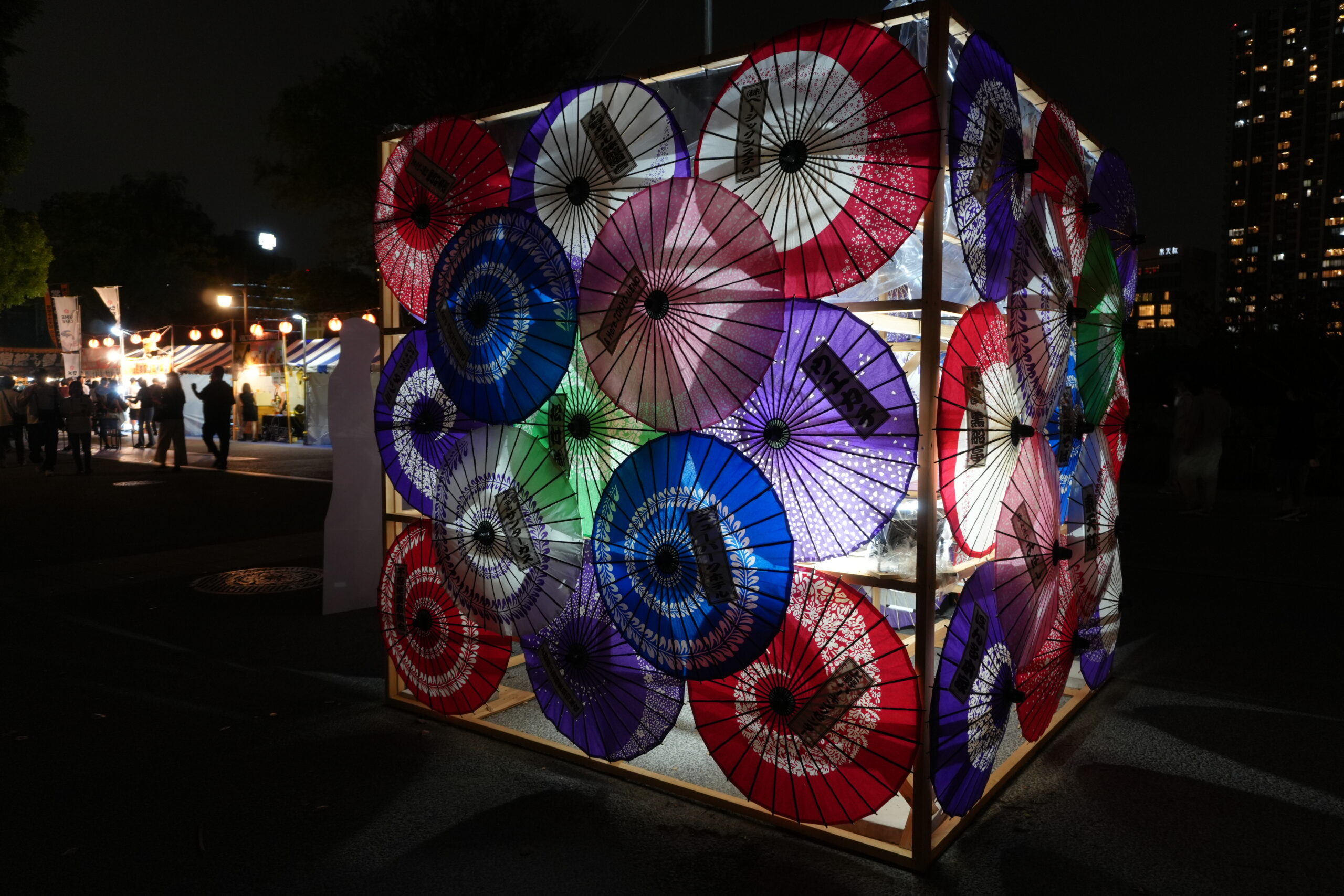 元々カラフルな和傘に光が照らされ、闇夜に浮かぶ和傘の煌彩はまるで光の屏風という感じだ